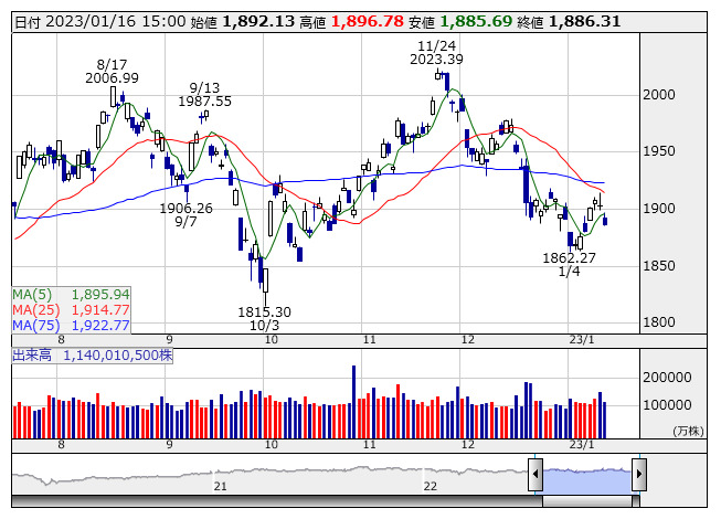 2023年01月16日15時17分 【市況】TOPIX先物:16日清算値=19ポイント安、1882.5ポイント TOPIX <日足> 「株探」多機能チャートより 16日15時15分、TOPIX先物期近2023年3月限は前週末清算値比19ポイント安の1882.5ポイントで取引を終えた。出来高は4万4842枚だった。この日のTOPIXの現物終値1886.31ポイントに対しては3.81ポイント安。 株探ニュース
