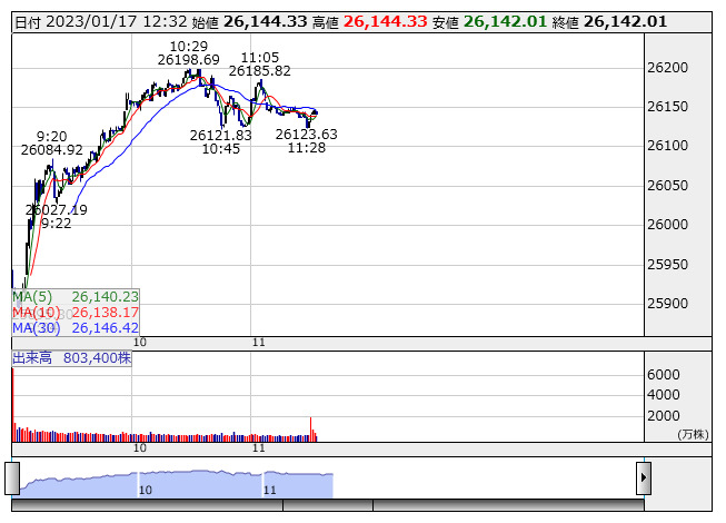 2023年01月17日12時31分 【市況】東京株式(後場寄り付き)=日経平均株価は前場終値比で横ばい 日経平均 <1分足> 「株探」多機能チャートより 後場寄り付き直後の東京株式市場では、日経平均株価が前営業日比320円高前後と前場終値と比較して横ばい圏で推移している。外国為替市場では1ドル=128円80銭台の推移。アジアの主要株式市場は総じて軟調。 出所:MINKABU PRESS