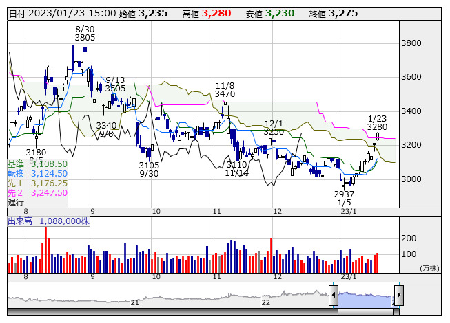 出光興産 <日足> 一目均衡表 「株探」多機能チャートより本特集では、テクニカル指標「一目均衡表」のなかでも最も強い買いシグナルである「3役好転」と株価指標の割安・割高感を示す「PER」、「PBR」に注目。プライム市場において、上昇トレンドを示唆した可能性が高い「3役好転」銘柄 100社の中から、プライム市場平均の予想PERが 13.21倍、PBRが 1.13倍を下回り上値余地があるとみられる 45社を選び出しました。