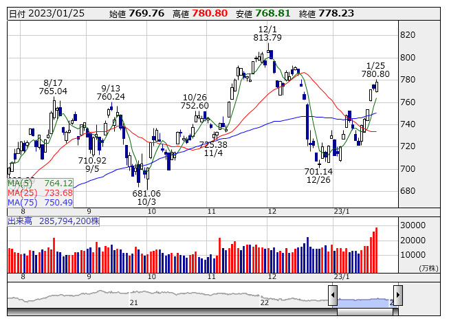 2023年01月26日08時46分 【市況】マザーズ先物:26日寄り付き=4ポイント高、779ポイント マザーズ指数 <日足> 「株探」多機能チャートより 26日8時45分、東証マザーズ指数先物期近2023年3月限は前日清算値比4ポイント高の779ポイントで寄り付いた。前日の東証マザーズ指数の現物終値778.23ポイントに対しては0.77ポイント高。夜間取引の終値781ポイントに対しては2ポイント安となっている。 株探ニュース
