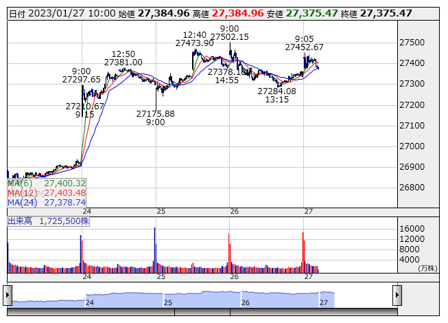 【市況】10時の日経平均は19円高の2万7382円、信越化が26.54円押し上げ