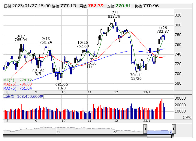 2023年01月27日15時17分 【市況】マザーズ先物:27日清算値=11ポイント安、766ポイント マザーズ指数 <日足> 「株探」多機能チャートより 27日15時15分、東証マザーズ指数先物期近2023年3月限は前日清算値比11ポイント安の766ポイントで取引を終えた。出来高は4305枚だった。この日の東証マザーズ指数の現物終値770.96ポイントに対しては4.96ポイント安。 株探ニュース
