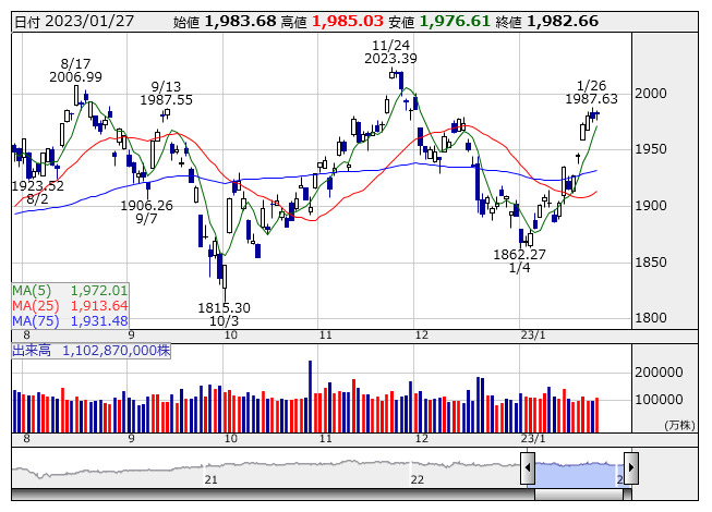 TOPIX <日足> 「株探」多機能チャートより2027.41ポイント ボリンジャーバンド3σ