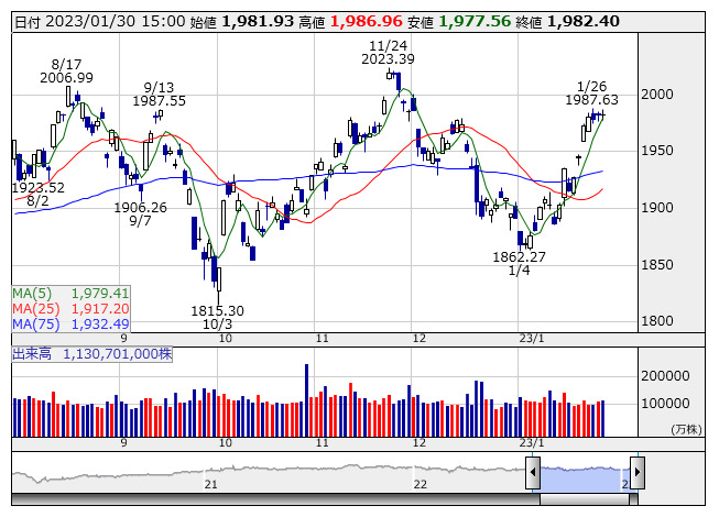 1930.49ポイント 75日移動平均