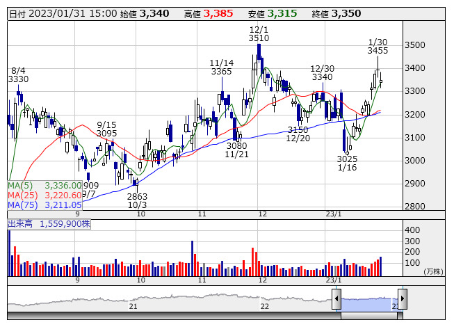 同時に発表した第3四半期累計(22年4~12月)決算は、売上高1364億6700万円(前年同期比10.3%増)、営業利益446億3500万円(同15.1%増)、純利益312億1300万円(同17.1%増)だった。