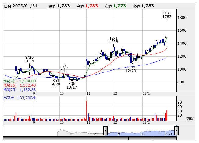 東証プライムの上昇率6位。NECキャピタルソリューション <8793> [東証P]が8日続急伸、時価は20年2月以来約3年ぶりの高値圏となった。昨年12月下旬を境に一貫した上昇トレンドを形成、短期タームでも31日を含めた直近12営業日で前日終値を下回ったのはわずかに1日だけと上値指向が極めて強い。同社はNEC系のリース大手で情報通信機器を主に取り扱っている。足もとの業績はリース事業、インベストメント事業いずれも好調で、会社側想定を上回って推移している。30日取引終了後に23年3月期通期業績予想の修正を発表、営業利益は従来予想の110億円から130億円(前期比24%増)に増額したほか、年間配当も従来計画の74円に36円上乗せして110円としており、これを好感する投資資金が流入した。配当利回りは前日30日終値換算で4.74%に達することで、インカムゲイン狙いの買いも呼び込んだ。