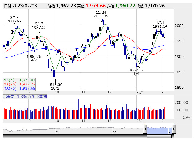 1970.26ポイント 3日TOPIX現物終値