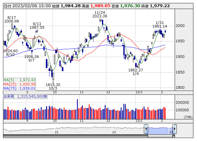 2023年02月06日15時17分 【市況】TOPIX先物:6日清算値=11.5ポイント高、1979.5ポイント TOPIX <日足> 「株探」多機能チャートより 6日15時15分、TOPIX先物期近2023年3月限は前週末清算値比11.5ポイント高の1979.5ポイントで取引を終えた。出来高は6万1448枚だった。この日のTOPIXの現物終値1979.22ポイントに対しては0.28ポイント高。 株探ニュース