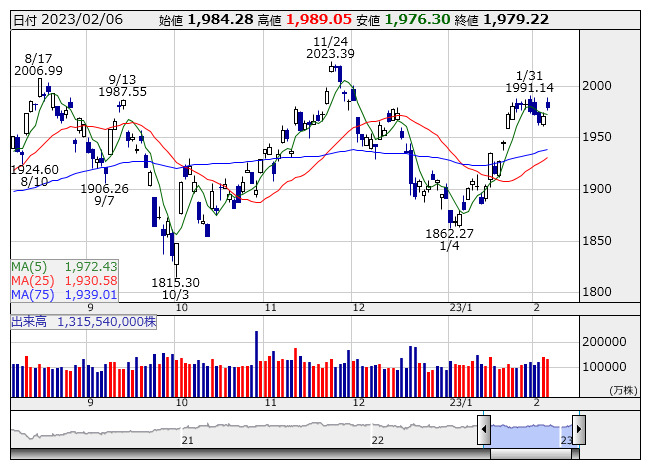 2023年02月07日08時46分 【市況】TOPIX先物:7日寄り付き=3.5ポイント高、1983ポイント TOPIX <日足> 「株探」多機能チャートより 7日8時45分、TOPIX先物期近2023年3月限は前日清算値比3.5ポイント高の1983ポイントで寄り付いた。前日のTOPIXの現物終値1979.22ポイントに対しては3.78ポイント高。夜間取引の終値1979.5ポイントに対しては3.5ポイント高となっている。 株探ニュース