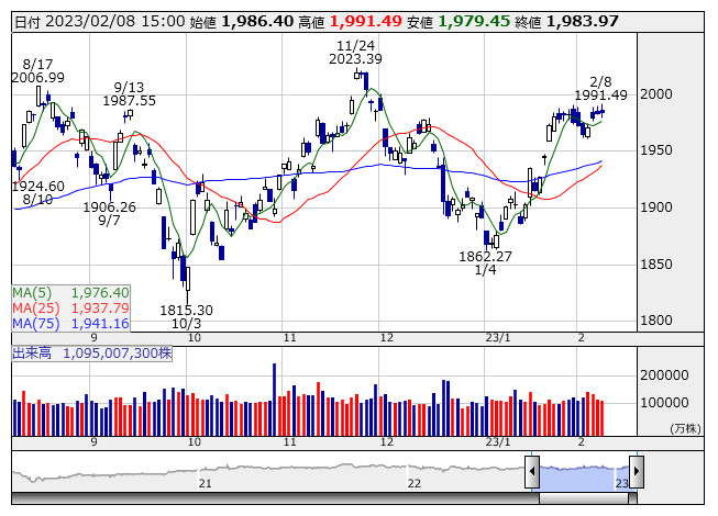 2023年02月08日15時17分 【市況】TOPIX先物:8日清算値=3.5ポイント高、1983ポイント TOPIX <日足> 「株探」多機能チャートより 8日15時15分、TOPIX先物期近2023年3月限は前日清算値比3.5ポイント高の1983ポイントで取引を終えた。出来高は4万8711枚だった。この日のTOPIXの現物終値1983.97ポイントに対しては0.97ポイント安。 株探ニュース
