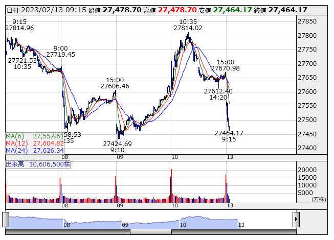 2023年02月13日09時17分 【市況】日経平均の下げ幅が200円を超える 日経平均 <5分足> 「株探」多機能チャートより 日経平均株価の下げ幅が200円を超えた。9時16分現在、206.81円安の2万7464.17円まで下落している。 株探ニュース