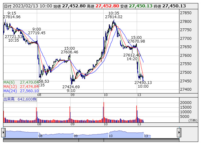 【市況】10時の日経平均は220円安の2万7450円、東エレクが61.98円押し下げ