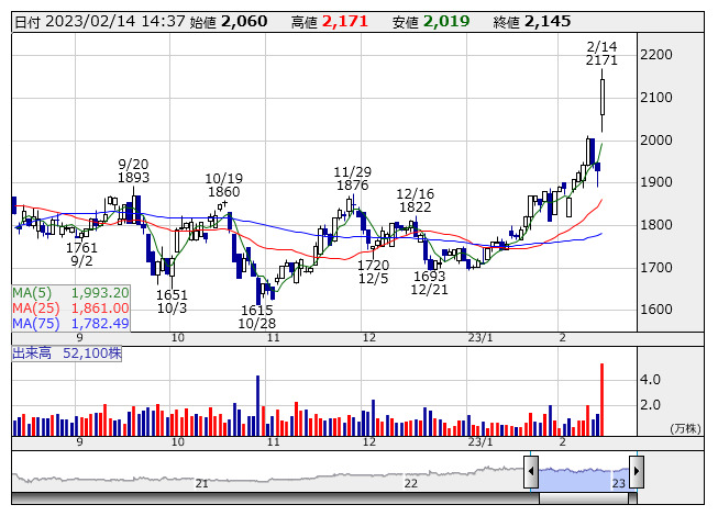同時に、上限を19万5000株(発行済み株数の1.86%)、または3億5000万円とする自社株買いを実施すると発表しており、これも好材料視されている。取得期間は2月14日から7月31日まで。また、2月28日付で46万4016株(同3.81%)の自社株を消却すると発表した。消却後の発行済み株数は1170万株となる予定だ。