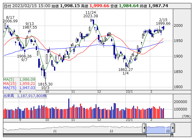 TOPIX <日足> 「株探」多機能チャートより2055.67ポイント ボリンジャーバンド3σ