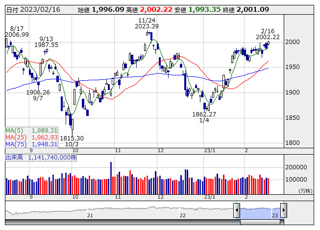 TOPIX <日足> 「株探」多機能チャートより2054.12ポイント ボリンジャーバンド3σ