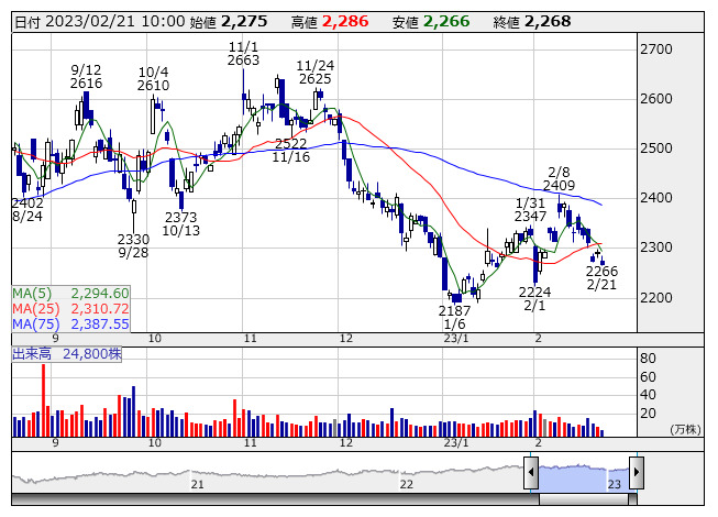 2023年02月21日10時00分 【材料】<注目銘柄>=NSD、銀行と官庁需要取り込み最高益更新続く NSD <日足> 「株探」多機能チャートより NSD<9759>はここ調整色を強め25日移動平均線を下回ってきたが、足もとの業績は好調であり逆張りの好機とみたい。同社は独立系のシステムインテグレーターで金融向けなどに高い実績を有する。M&A戦略なども奏功して業容拡大を続けており、前期まで10期連続で増収営業増益を達成、売上高・営業利益いずれも過去最高を更新中だ。銀行向けソフト開発需要を取り込むほか、官公庁のデジタルトランスフォーメーション(DX)案件も寄与し、23年3月期もピーク更新基調に変化はない。 26年3月期を最終年度とした中期経営計画も推進中で、トップラインは1000億円(前期実績711億8800万円)、営業利益は150億円(同114億1400万円)を目指す方針。株価は昨年11月につけた2663円の昨年来高値奪回が目標となる。(桂) 出所:MINKABU PRESS