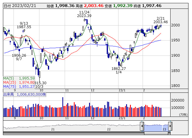 2023年02月22日08時46分 【市況】TOPIX先物:22日寄り付き=13ポイント安、1982.5ポイント TOPIX <日足> 「株探」多機能チャートより 22日8時45分、TOPIX先物期近2023年3月限は前日清算値比13ポイント安の1982.5ポイントで寄り付いた。前日のTOPIXの現物終値1997.46ポイントに対しては14.96ポイント安。夜間取引の終値1987.5ポイントに対しては5ポイント安となっている。 株探ニュース