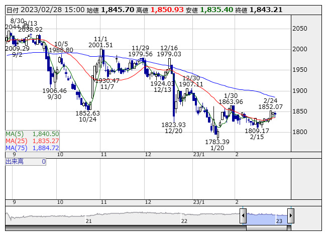 2023年02月28日15時17分 【市況】東証REIT指数先物:28日清算値=10ポイント高、1854.5ポイント REIT指数 <日足> 「株探」多機能チャートより 28日15時15分、東証REIT指数先物期近2023年3月限は前日清算値比10ポイント高の1854.5ポイントで取引を終えた。出来高は325枚だった。この日の東証REIT指数の現物終値1843.21ポイントに対しては11.29ポイント高。 株探ニュース