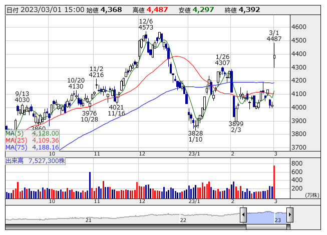 味の素 <日足> 「株探」多機能チャートよりカナデン<8081>が急反発。2月28日の取引終了後、上限を250万株(発行済み株数の9.65%)、または28億4250万円とする自社株を、3月1日朝の東京証券取引所の自己株式立会外買付取引(ToSTNeT-3)で取得すると発表。あわせて、500万株(同17.48%)を上限に3月8日付で自社株を消却するとしており、これを好感した買いが入った。なお、この日午前11時に自社株248万4000株(同9.58%)をToSTNeT-3で取得したと発表した。