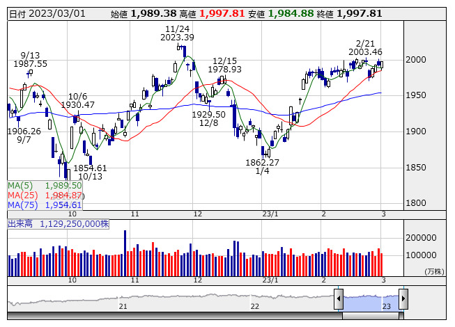 2023年03月02日08時46分 【市況】TOPIX先物:2日寄り付き=1ポイント安、1996.5ポイント TOPIX <日足> 「株探」多機能チャートより 2日8時45分、TOPIX先物期近2023年3月限は前日清算値比1ポイント安の1996.5ポイントで寄り付いた。前日のTOPIXの現物終値1997.81ポイントに対しては1.31ポイント安。夜間取引の終値1995.5ポイントに対しては1ポイント高となっている。 株探ニュース