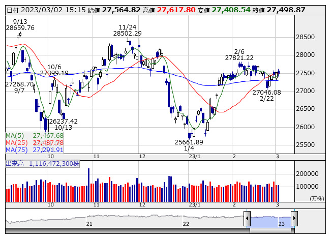 2023年03月02日18時15分 【テク】日経平均テクニカル:3日ぶり小反落、高値安値ともに切り上げ 日経平均 <日足> 「株探」多機能チャートより 2日の日経平均は3日ぶりに小反落した。ローソク足は陰線を引き、終値は節目の27500円をわずかに下回った。反面、ザラ場高値と安値はともに前日水準から切り上がったほか、終値は25日移動平均線上方をキープし、5日線が上向きに転じるなど強弱感が定まらなかった。 《CS》 提供:フィスコ