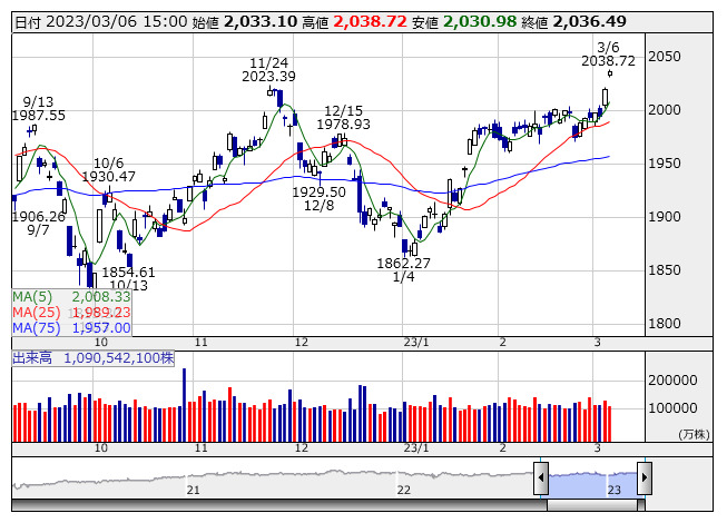 TOPIX <日足> 「株探」多機能チャートより2036.49ポイント 6日TOPIX現物終値