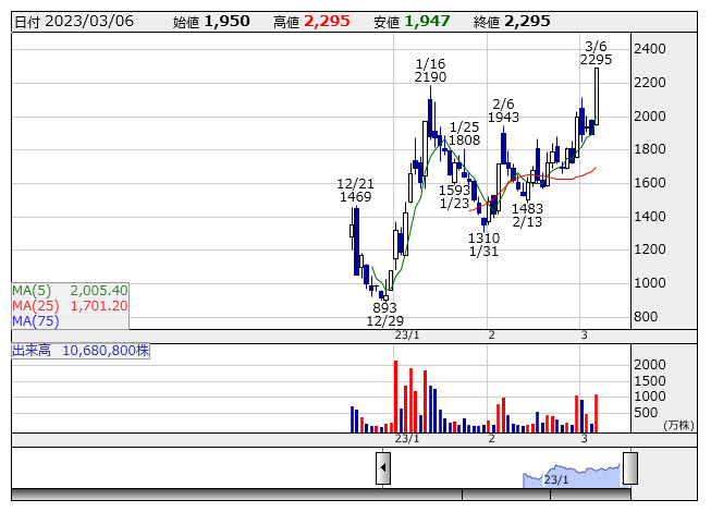 クリングル <4884> 1,386 +61 ( +4.6%) 31,700 ( 4,396) 31,400 ( 4,352)