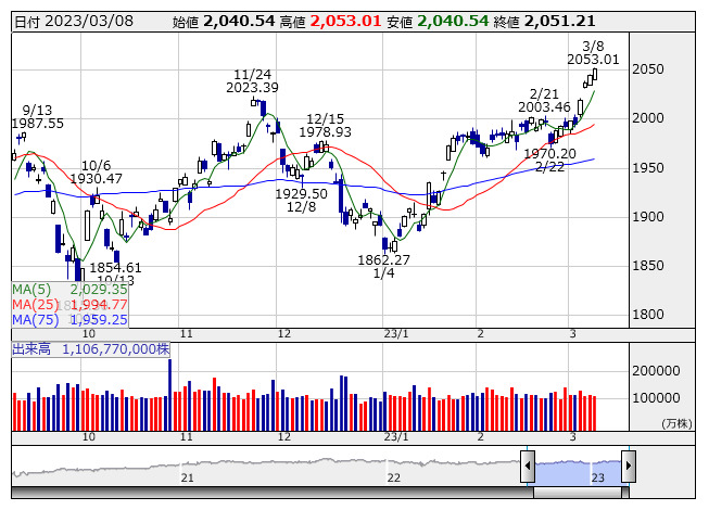 2023年03月09日08時46分 【市況】TOPIX先物:9日寄り付き=14.5ポイント高、2065ポイント TOPIX <日足> 「株探」多機能チャートより 9日8時45分、TOPIX先物期近2023年3月限は前日清算値比14.5ポイント高の2065ポイントで寄り付いた。前日のTOPIXの現物終値2051.21ポイントに対しては13.79ポイント高。夜間取引の終値2060ポイントに対しては5ポイント高となっている。 株探ニュース
