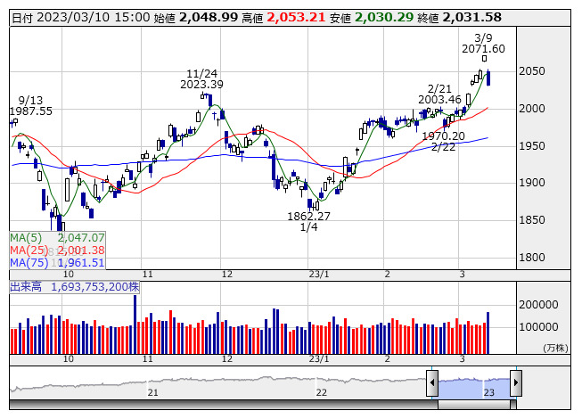 TOPIX <日足> 「株探」多機能チャートより2075.62ポイント ボリンジャーバンド3σ