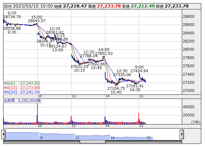 【市況】10時の日経平均は5円安の2万7216円、ファストリが46.74円押し下げ