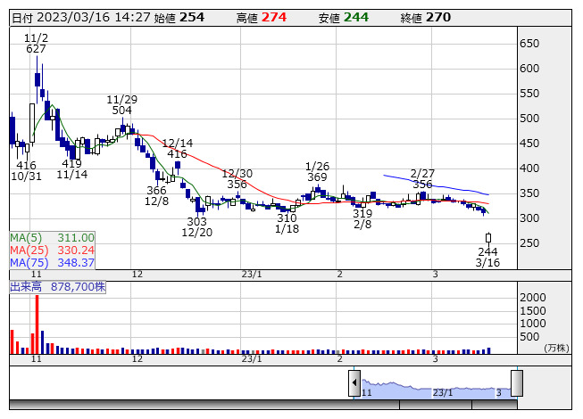 リンカーズ <日足> 「株探」多機能チャートより探索・マッチングサービスでは「Linkers Sourcing」及び「Linkers Marketing」の着手案件数が減少したものの、リサーチサービスは好調に推移した。コスト面では、「Linkers Trading」サービスによる仕入高の発生や、リサーチ外注費用、人件費、システム関係費用の増加などが響いた。