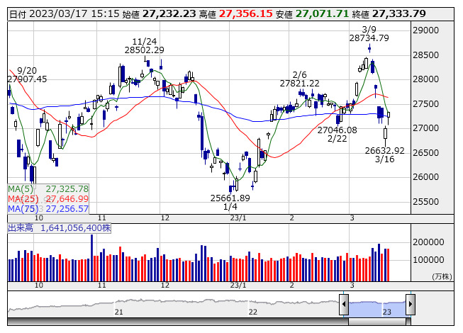 日経平均 <日足> 「株探」多機能チャートより日本取引所が公表した先物手口情報によると、3月17日の日経225先物期近(2023年6月限)の夜間取引(立会内・J-NETの合算)で、買い越しトップはABNクリアリン証券の1834枚、売り越しトップはSBI証券の1861枚だった。