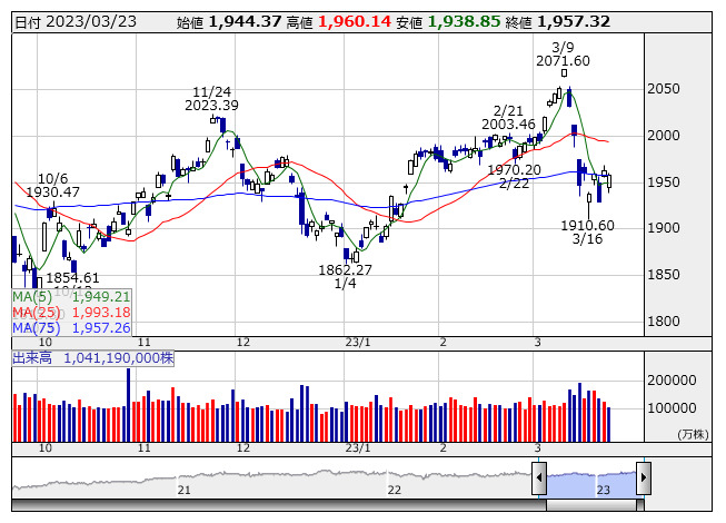 TOPIX <日足> 「株探」多機能チャートより2115.05ポイント ボリンジャーバンド3σ