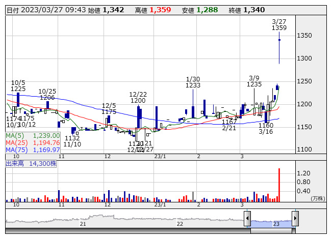 兼松エンジ <日足> 「株探」多機能チャートより21年8月に稼働を開始した新工場「テクノベース」が、高知県及び高知市からの補助金及び助成金の対象となり、23年3月期第4四半期において補助金及び助成金3億7000万円を特別利益として計上したことが要因としている。なお、売上高110億円(前期比7.3%減)、営業利益6億8500万円(同33.2%減)は従来見通しを据え置いている。