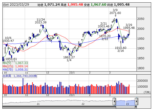 2023年03月30日08時46分 【市況】TOPIX先物:30日寄り付き=8ポイント高、1978.5ポイント TOPIX <日足> 「株探」多機能チャートより 30日8時45分、TOPIX先物期近2023年6月限は前日清算値比8ポイント高の1978.5ポイントで寄り付いた。前日のTOPIXの現物終値1995.48ポイントに対しては16.98ポイント安。夜間取引の終値1984.5ポイントに対しては6ポイント安となっている。 株探ニュース