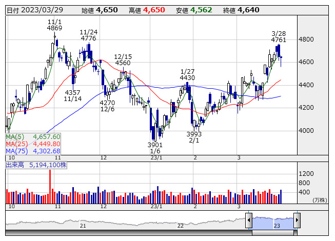 OBC <4733> 4,800 -160 ( -3.2%) 52,100 ( 25,008) 46,600 ( 22,344)