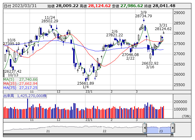 2023年04月03日06時55分 【市況】シカゴ日経平均先物 大取終値比 115円高 (3月31日) 日経平均 <日足> 「株探」多機能チャートよりシカゴ日経225先物6月限 (円建て) 28205 ( +115 ) シカゴ日経225先物6月限 (ドル建て) 28270 ( +180 ) ※( )は大阪取引所終値比 株探ニュース