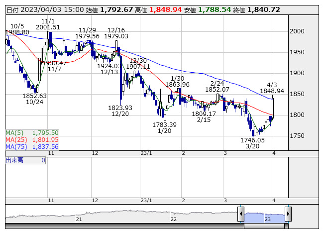 2023年04月03日15時17分 【市況】東証REIT指数先物:3日清算値=58ポイント高、1834.5ポイント REIT指数 <日足> 「株探」多機能チャートより 3日15時15分、東証REIT指数先物期近2023年6月限は前週末清算値比58ポイント高の1834.5ポイントで取引を終えた。出来高は1407枚だった。この日の東証REIT指数の現物終値1840.72ポイントに対しては6.22ポイント安。 株探ニュース