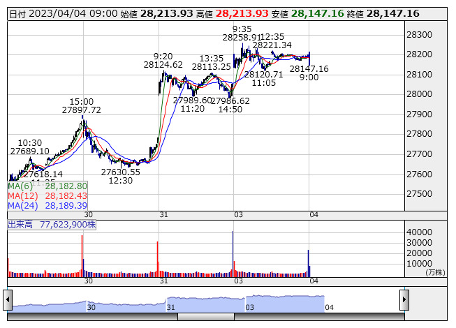 2023年04月04日09時02分 【市況】日経平均4日寄り付き=25円高、2万8213円 日経平均 <5分足> 「株探」多機能チャートより 4日の日経平均株価は前日比25.78円高の2万8213.93円で寄り付いた。 株探ニュース
