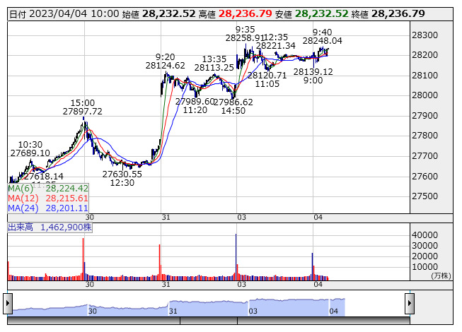 【市況】10時の日経平均は45円高の2万8233円、東エレクが18.81円押し上げ
