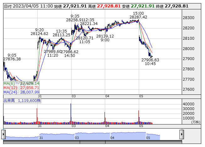 【市況】11時の日経平均は364円安の2万7922円、ファストリが40.16円押し下げ