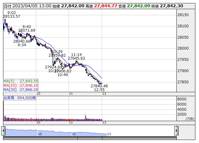 【市況】13時の日経平均は445円安の2万7841円、ファストリが66.08円押し下げ