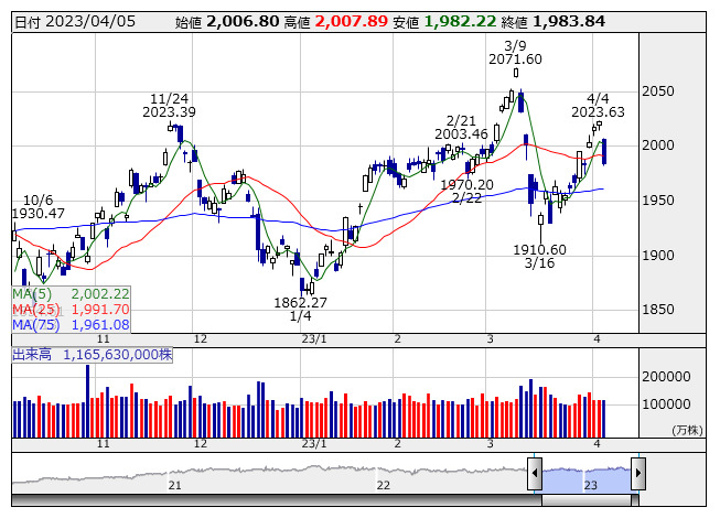 2023年04月06日08時46分 【市況】TOPIX先物:6日寄り付き=15ポイント安、1967ポイント TOPIX <日足> 「株探」多機能チャートより 6日8時45分、TOPIX先物期近2023年6月限は前日清算値比15ポイント安の1967ポイントで寄り付いた。前日のTOPIXの現物終値1983.84ポイントに対しては16.84ポイント安。夜間取引の終値1969ポイントに対しては2ポイント安となっている。 株探ニュース