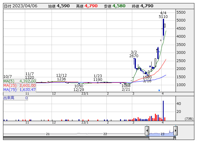 元旦 <日足> 「株探」多機能チャートより6日寄り付き ストップ高: 5銘柄 ストップ安: 1銘柄 (気配、一時を含む)