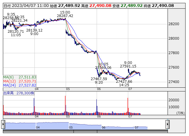 【市況】11時の日経平均は17円高の2万7490円、東エレクが23.38円押し上げ
