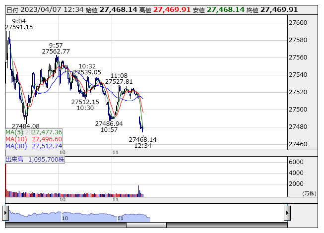 2023年04月07日12時35分 【市況】日経平均がマイナス転換 日経平均 <1分足> 「株探」多機能チャートより 日経平均株価がマイナス転換。12時34分現在、4.49円安の2万7468.14円まで下落している。 株探ニュース