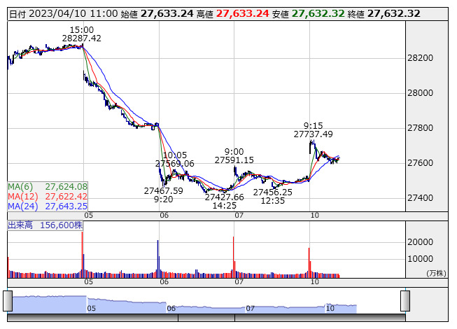 【市況】11時の日経平均は114円高の2万7632円、ファストリが42.19円押し上げ