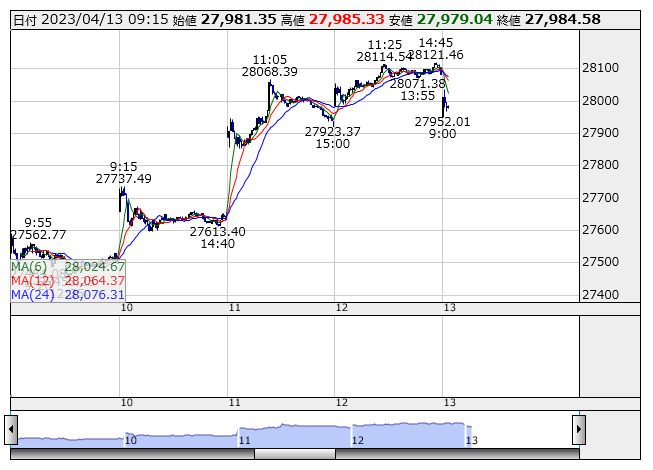 日経平均 <5分足> 売買代金 「株探」多機能チャートより個別ではUBS 欧州株 <1386> 、WisdomTree 銀上場投資信託 <1673> 、NEXT 運輸・物流 <1628> 、NEXT NOMURA原油インデックス連動型上場投信 <1699> 、NEXT 原油ブル <2038> など6銘柄が新高値。NEXT NOTES ドバイ原油先物 ベア ETN <2039> が新安値をつけている。