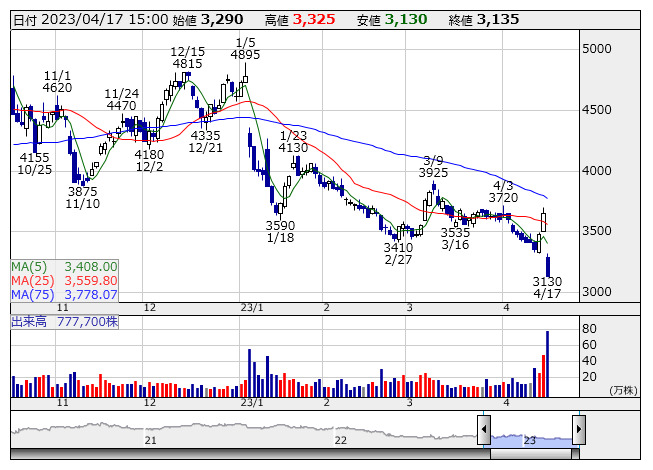 JINSHD <日足> 「株探」多機能チャートよりジンズホールディングス<3046>が急反落。前週末14日の取引終了後に23年8月期業績予想の下方修正を発表。売上高を781億円から734億8600万円(前期比9.8%増)へ、営業利益を70億円から40億900万円(同20.9%増)へ引き下げており、これが嫌気された。中国のゼロコロナ政策による影響があったことが主な要因。また、大胆な戦略投資コストの追加を計画していることも響く見込み。あわせて、従来53円としていた配当予想を31円(前期17円)に減額した。なお、同時に発表した上期(22年9月~23年2月)決算は、売上高が345億5600万円(前年同期比5.7%増)、営業利益が20.7%減の15億900万円だった。