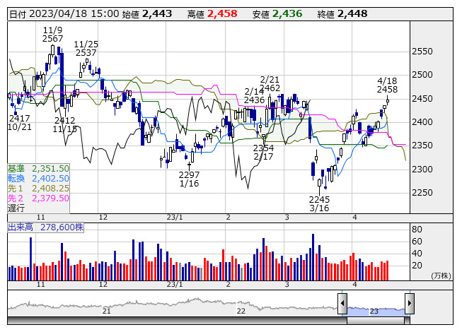 DIC <日足> 一目均衡表 「株探」多機能チャートより本特集では、テクニカル指標「一目均衡表」のなかでも最も強い買いシグナルである「3役好転」と株価指標の割安・割高感を示す「PER」、「PBR」に注目。プライム市場において、上昇トレンドを示唆した可能性が高い「3役好転」銘柄 97社の中から、プライム市場平均の予想PERが 14.39倍、PBRが 1.2倍を下回り上値余地があるとみられる 25社を選び出しました。